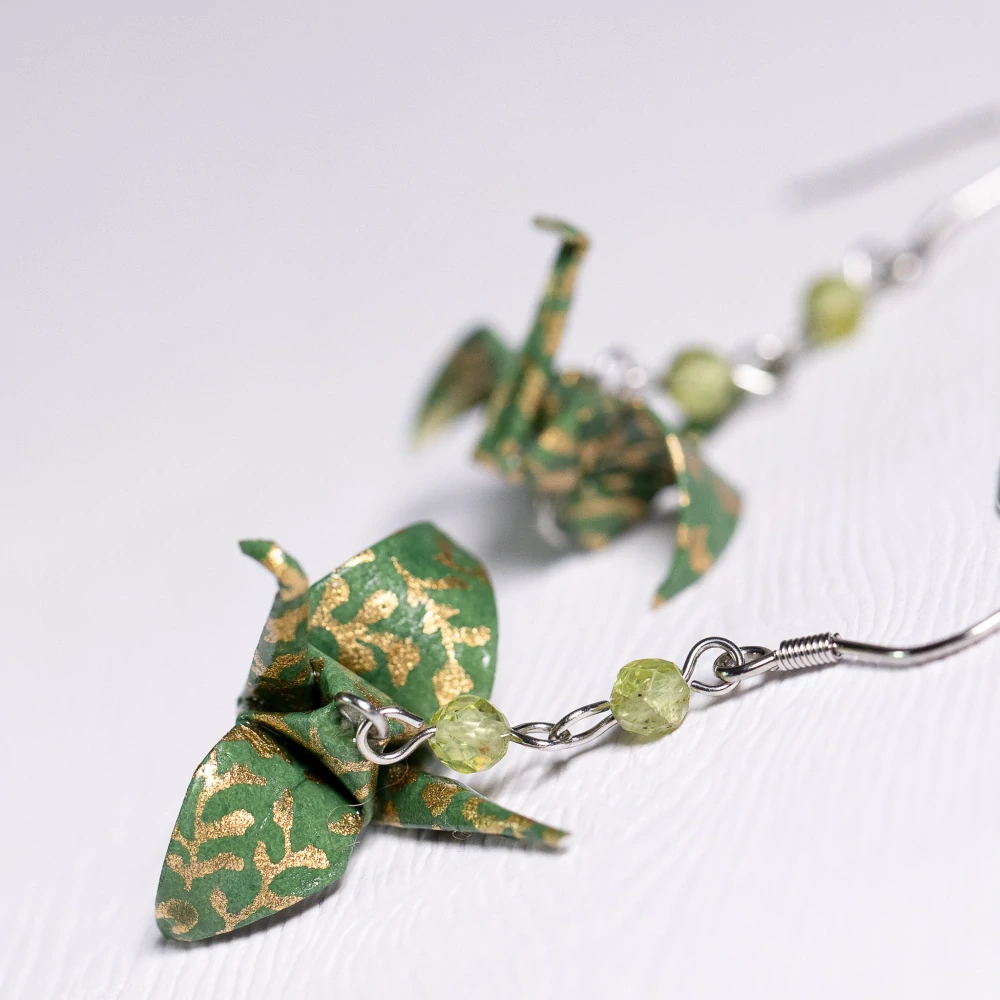 Náušnice vytvořené z washi origami papíru dovezeného ze zahraničí. Papír je jemný v zelené barvě se zlatým vzorem. Složila jsem z něj tvar tradičního jeřába a doplnila dvěma olivíny.