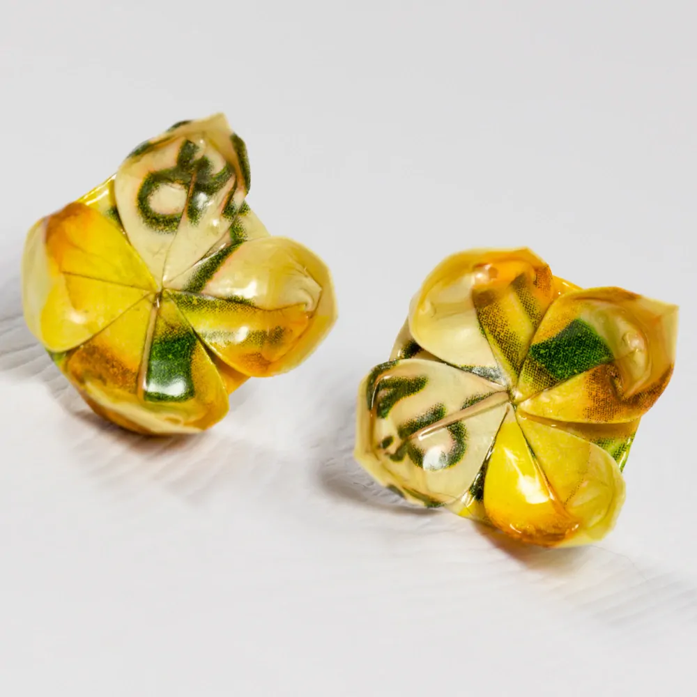 Jde o náušnice vytvořené origami technikou do tvaru lotosového květu na puzetě z chirurgické oceli. Květiny jsou složeny z papíru z čajových sáčků v barvě zelené a žluté. Lotos má rozměr cca 1,3 x 1,3 cm.