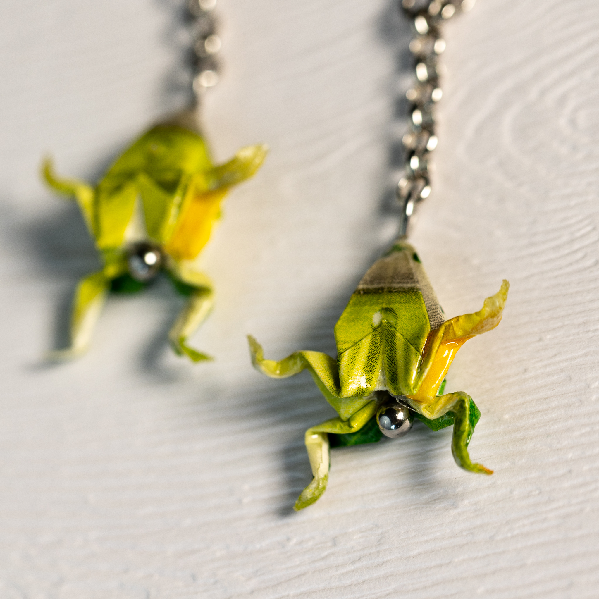 Náušnice vytvořené z čajových sáčků od čaje Green Tea original Lemon firmy Teekanne. Složila jsem z něj tvar žabky a zavěsila na řetízek.
