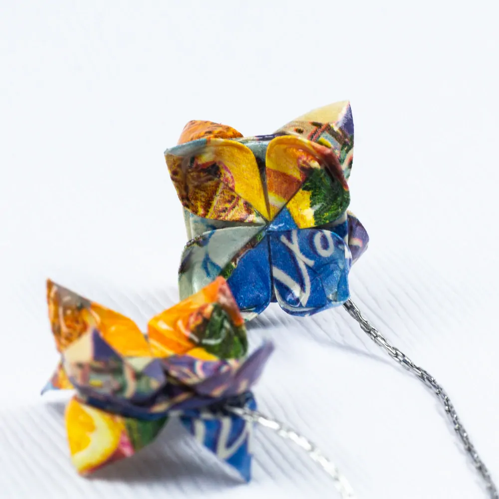Jde o náušnice tvořené origami květy. Květiny jsou složeny z čajových sáčků Teekanne Winter Time. Květy jsou místo náušnicového háčku upevněny na řetízku z chirurgické oceli, takže by nemělo dojít k žádným alergickým reakcím. Zarážka proti ztrátě je z drobná plastová (v případě Vašeho zájmu mohu dodat i klasickou kovovou - "motýlka").