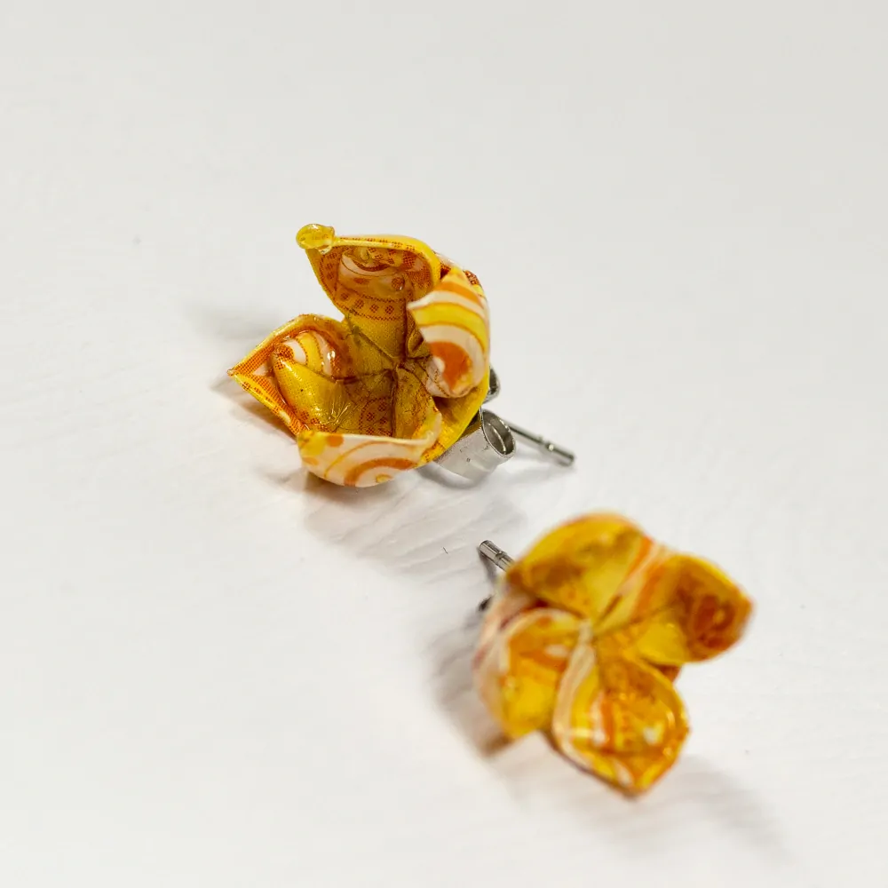 Jde o náušnice vytvořené origami technikou do tvaru lotosového květu na puzetě z chirurgické oceli. Květiny jsou složeny z origami papíru od firmy Heyda. Lotos má rozměr cca 1 x 1 cm.